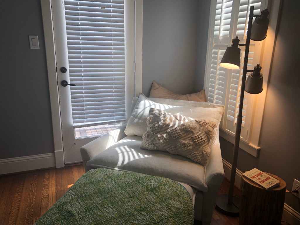 I have had this reading nook in the works for maybe a year and finally finished it by getting a lamp and a recycled-stump side table! I’m looking forward to having a place to read that isn’t the couch (i.e., away from the TV) or bed. Where do you like to read?