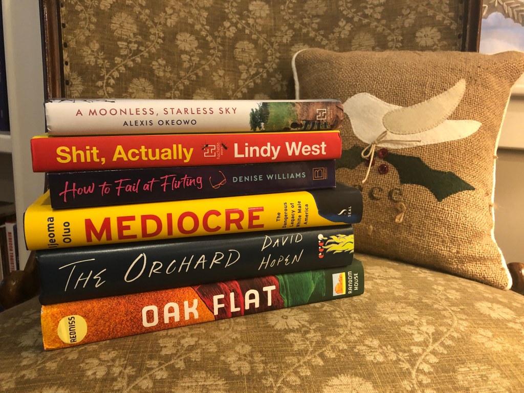This part of my pre-Christmas haul includes A Moonless, Starless Sky: Ordinary Women and Men Fighting Extremism in Africa, by Alexis Okeowo, which I’m looking forward to because my knowledge of modern Africa is, um, limited. I enjoyed Shrill, so I picked up Shit, Actually by Lindy West, which promises hilarious movie commentary. How to Fail at Flirting by Denise Williams features a professor trying to save her department. Mediocre: The Dangerous Legacy of White Male America by Ijeoma Olua will likely contain lots of preaching to the choir, but I’m looking forward to it. The Orchard by David Hopen is about a boy who has grown up in ultra-Orthodox Brooklyn and then enrolls in a fancy, rich Jewish academy when his family moves to Miami. Finally, Oak Flat by Lauren Redniss deals with a conflict between the Apache tribe and a mining company over sacred land.